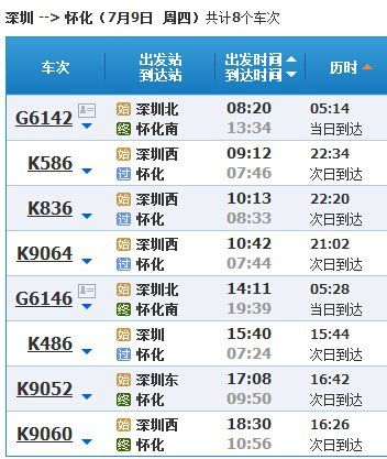 G6142次,深圳北到怀化南,5小时12分,早上8点发车中午1点半到怀化,到怀化南后打车去怀化汽车西站30分钟左右30元,也可以坐公交车12路到麻阳路口下走路去西站,在怀化汽车西站买票到凤凰,票价39元保险2元,不要保险提前说;车程1小时左右。