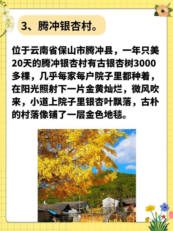 3、腾冲银杏村。一年只美20天的腾冲银杏村有古银杏树3000多棵,在阳光照射下一片金黄灿烂,微风吹来,小道上院子里银杏叶飘落,古朴的村落像铺了一层金色地毯。