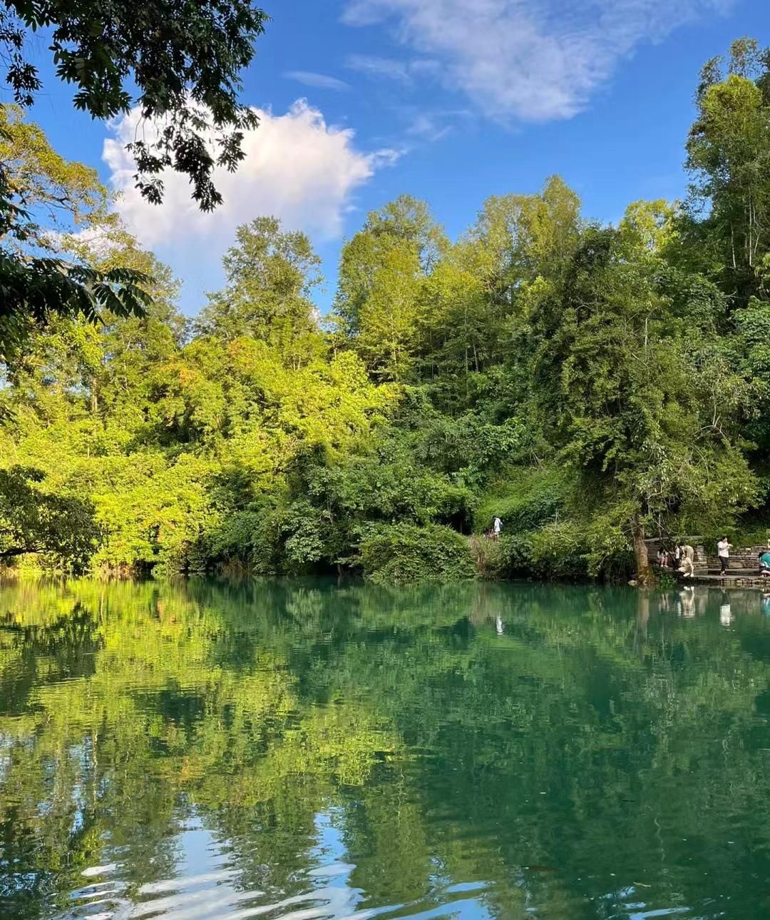 从东门坐到了小七孔古桥,本来想坐车到西门,结果人太多了,就逆流而上,徒步走了一段,玩了拉雅瀑布,水上森林,到石上森林站坐车到翠谷站,在翠谷玩了会水,再坐车到卧龙潭。