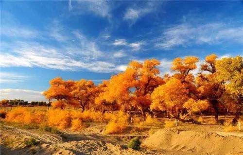 额济纳胡杨林旅游区拥有中国最奇妙的勾魂秋色,有着三千年不死,死后三千年不倒,倒后三千年不朽的胡杨林,曾因张艺谋的《英雄》中张曼玉和章子怡一场树林决战而名扬天下,如今又吸引无数人从全国各地慕名而来。据网上的资料,观赏金黄胡杨的时间为9月下旬到10月中旬,都能看到黄叶子,但最佳时间一般在10月5日前后。太早叶子还没有黄透;晚了会起风刮落树叶。