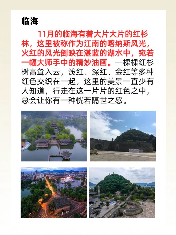 11月的临海有着大片大片的红杉林,这里被称作为江南的喀纳斯风光,火红的风光倒映在湛蓝的湖水中,宛若一幅大师手中的精妙油画。一棵棵红杉树高耸入云,浅红、深红、金红等多种红色交织在一起,这里的美景一直少有人知道,行走在这一片片的红色之中,总会让你有一种恍若隔世之感。