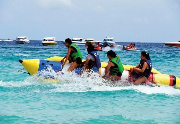 这是香蕉船,就像海上漂移,超级刺激。各式各样颜色的,大多数是黄色的。
