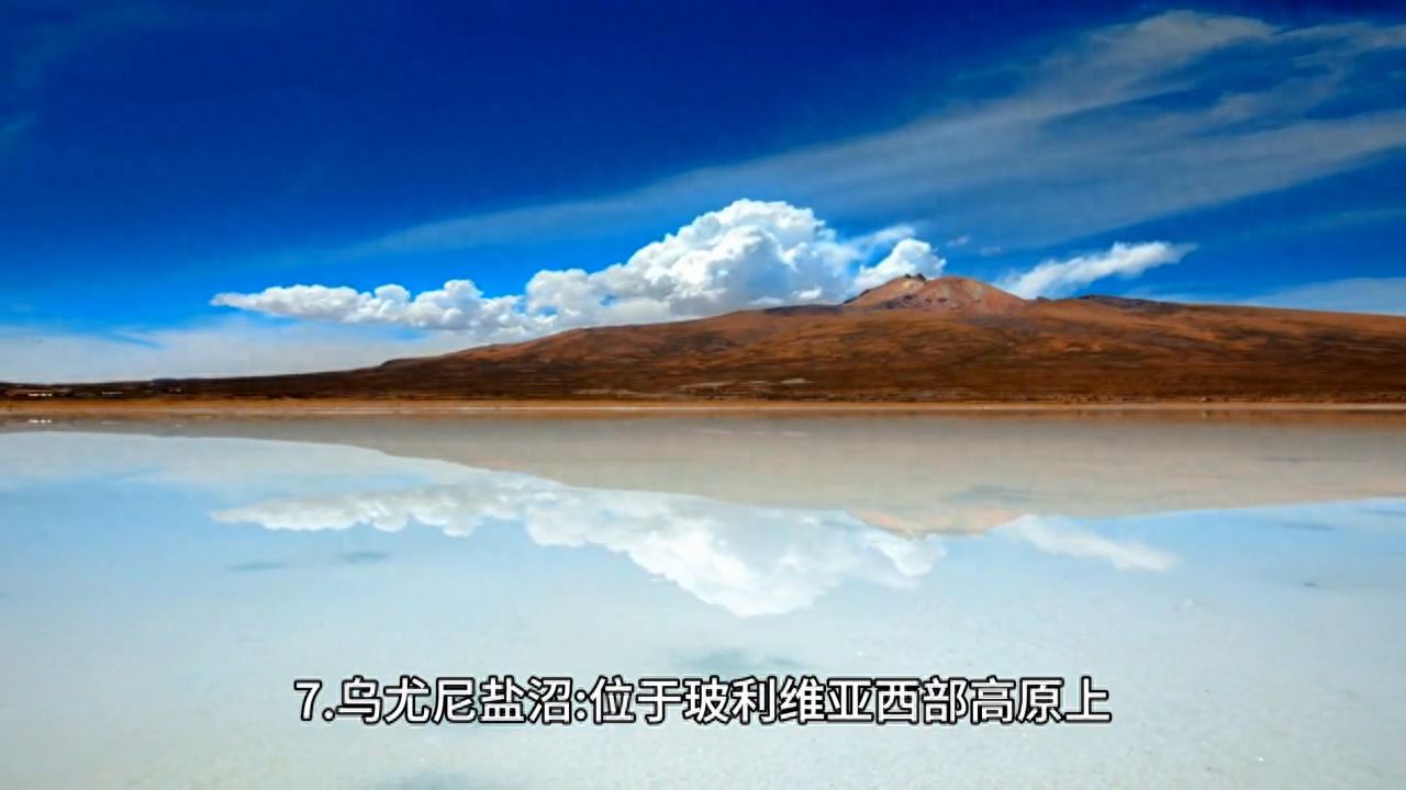 ·7.乌尤尼盐沼:位于玻利维亚西部高原上,是世界上最大的盐沼,同时也是全球最美的十个旅游胜地之一,享有天空之境的美誉。