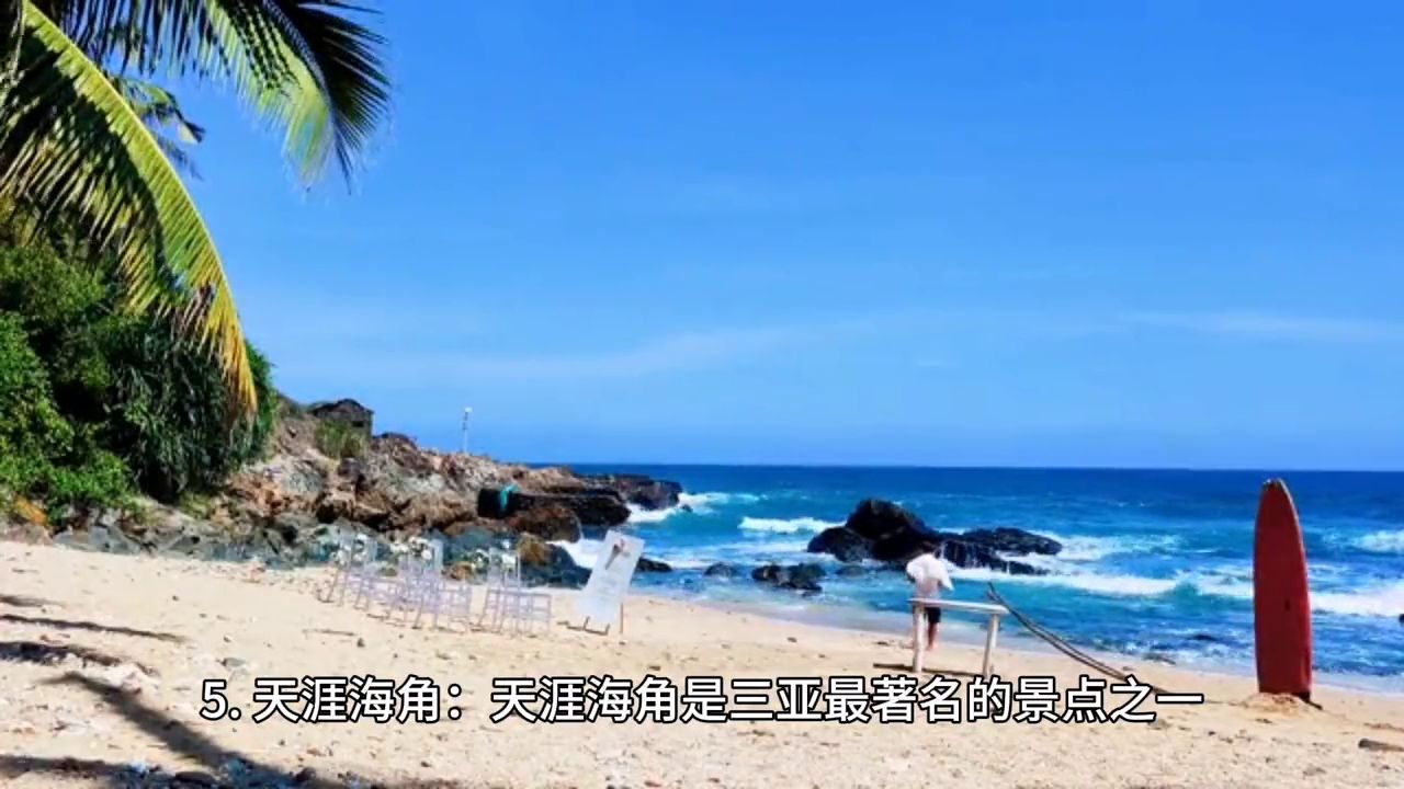 ·5.天涯海角:天涯海角是三亚最著名的景点之一,也是中国最浪漫的海滩之一。这里有两块巨大的岩石,分别刻有"天涯"和"海角"字样,是情侣们拍照留念的好去处。