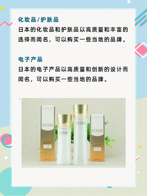 化妆品/护肤品:日本的化妆品和护肤品以高质量和丰富的选择而闻名,可以购买一些当地的品牌。