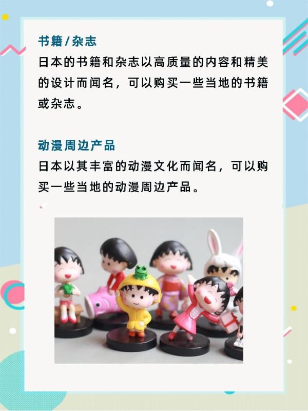 动漫周边产品:日本以其丰富的动漫文化而闻名,可以购买一些当地的动漫周边产品。