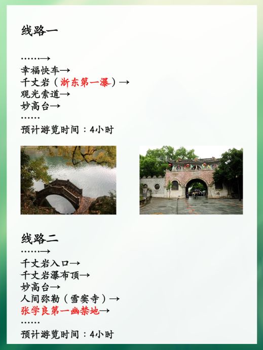 溪口-滕头旅游景区游客中心乘坐旅游直通车至雪窦寺中转站→千丈岩入口→妙高台→参观完妙高台景区后原路返回至千丈岩入口→人间弥勒(雪窦寺)→张学良第一幽禁地→雪窦寺中转站乘车→溪口-滕头旅游景区游客中心(该线路适合长者及运动量不适宜太大的游客)