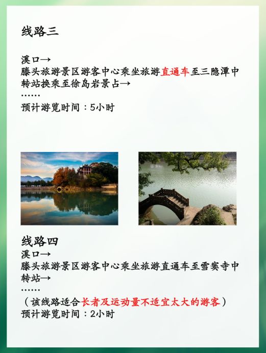 溪口-滕头旅游景区游客中心乘坐景区大巴直达三隐潭景点→三隐潭景点进入大峡谷瀑布群→参观完三隐潭景区后原路返回至三隐潭交通车中转站乘车→千丈岩入口→千丈岩瀑布顶→妙高台→人间弥勒(雪窦寺)→张学良第一幽禁地→雪窦寺中转站乘车→溪口-滕头旅游景区游客中心
