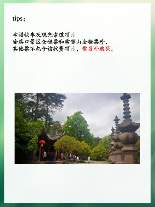溪口景区门票 180元/人+雪窦山景区交通票30元/人+幸福列车及索道费50元/人