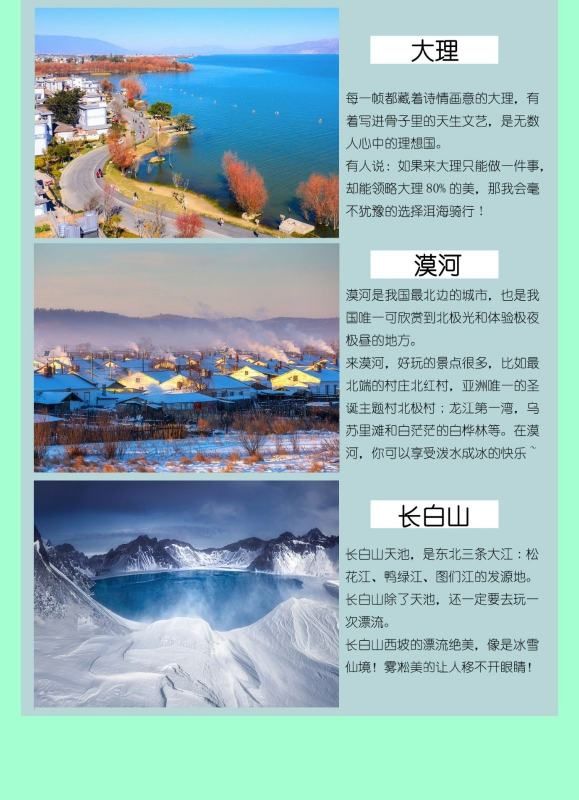 漠河是我国最北边的城市,也是我国唯一可欣赏到北极光和体验极夜极昼的地方。来漠河,好玩的景点很多,比如最北端的村庄北红村,亚洲唯一的圣议主题村北极村;龙江第一湾,马苏里滩和白茫茫的白桦林等。在漠河,你可以享受泼水成冰的快乐~