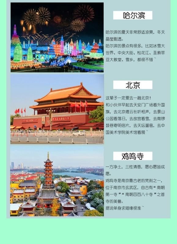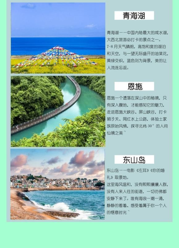 4. 青岛:青岛是一个美丽的海滨城市,拥有壮丽的海岸线和清新的空气。你可以游览栈桥、崂山、五四广场等知名景点,并品尝当地的海鲜美食。