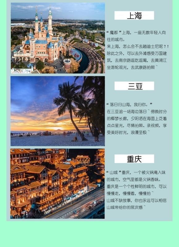 “魔都”上海,一座无数年轻人向往的城市。来上海,怎么会不去赵迪士尼呢?!除此之外,可以去外滩感受万国建筑,去南京路逛吃逛喝,去黄浦江坐游轮观光,去武康路拍照~