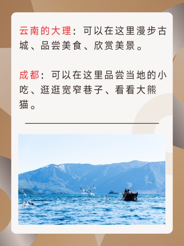 成都:成都是一个悠闲的城市,有着浓厚的文化底蕴和美食。你可以在这里品尝当地的小吃、逛逛宽窄巷子、看看大熊猫,感受成都人的生活方式。