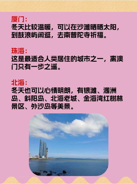 厦门:这是一个海岛,冬天比较温暖,可以在沙滩晒晒太阳,到鼓浪屿闲逛,去南普陀寺祈福。