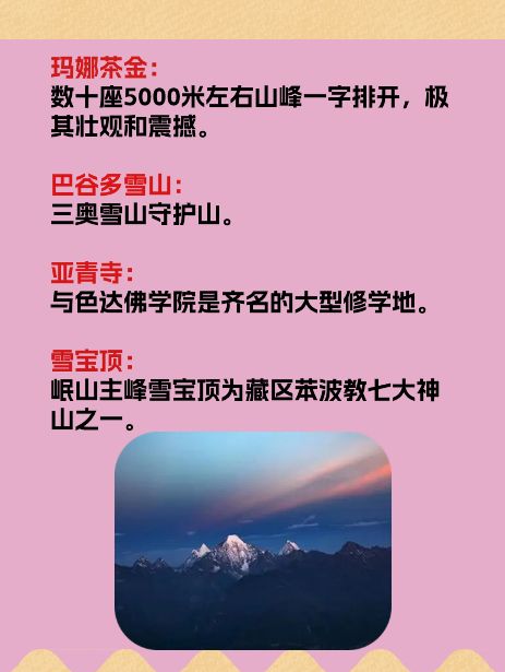 玛娜茶金:位于青藏高原和云贵高原结合部分横断山脉中段,数十座5000米左右山峰一字排开,极其壮观和震撼。