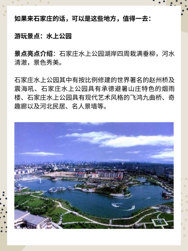 石家庄水上公园其中有按比例修建的世界著名的赵州桥及震海吼、石家庄水上公园具有承德避暑山庄特色的烟雨楼、石家庄水上公园具有现代艺术风格的飞鸿九曲桥、奇趣廊以及河北民居、名人景墙等。