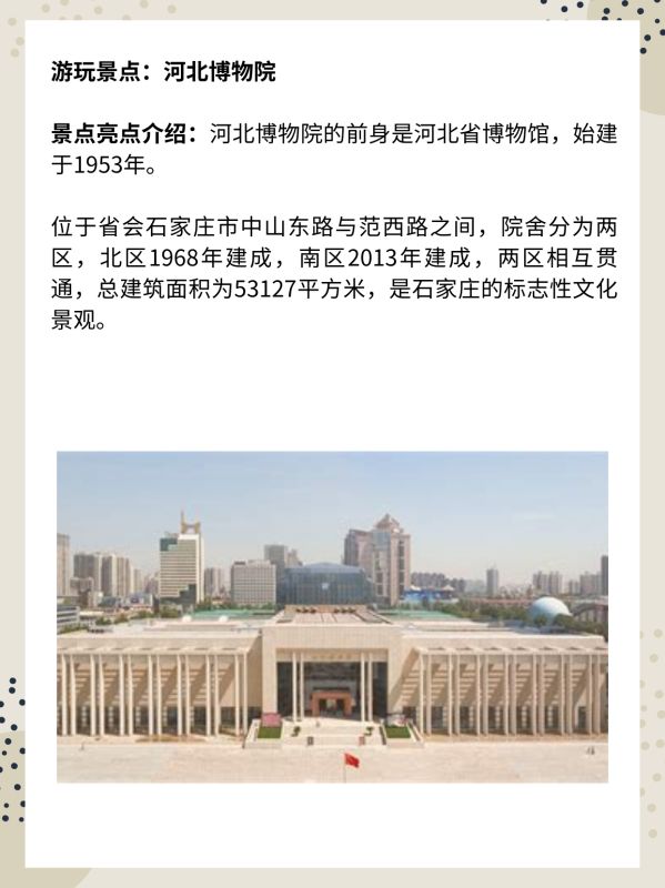 景点亮点介绍:河北博物院的前身是河北省博物馆,始建于1953年。
