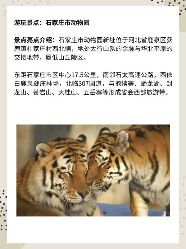 景点亮点介绍:石家庄市动物园新址位于河北省鹿泉区获鹿镇杜家庄村西北侧,地处太行山系的余脉与华北平原的交接地带,属低山丘陵区。