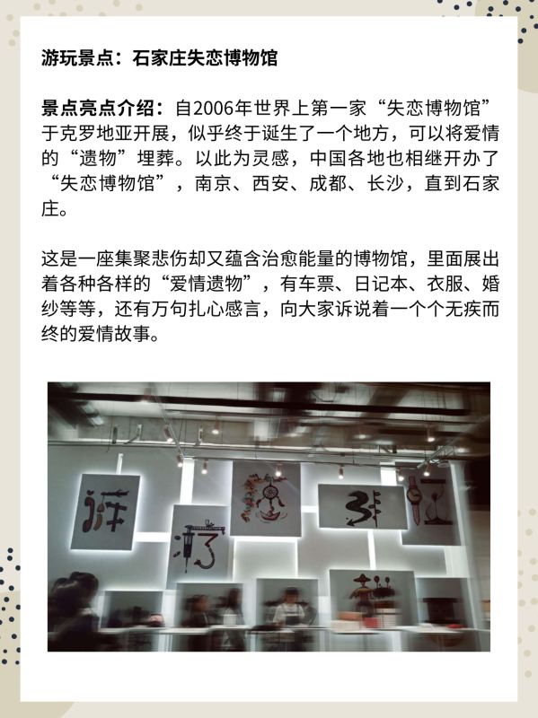 景点亮点介绍:自2006年世界上第一家“失恋博物馆”于克罗地亚开展,似乎终于诞生了一个地方,可以将爱情的“遗物”埋葬。以此为灵感,中国各地也相继开办了“失恋博物馆”,南京、西安、成都、长沙,直到石家庄。
