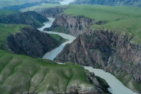 绿意盎然的群山环抱之中,一个大峡谷突现眼前,在阳光照耀下,一条五彩“丝带”曲曲折折地飘落在峡谷中央,这大峡谷就是阔克苏大峡谷,而那五彩“丝带”,正是流经阔克苏大峡谷形成的九曲十八弯。