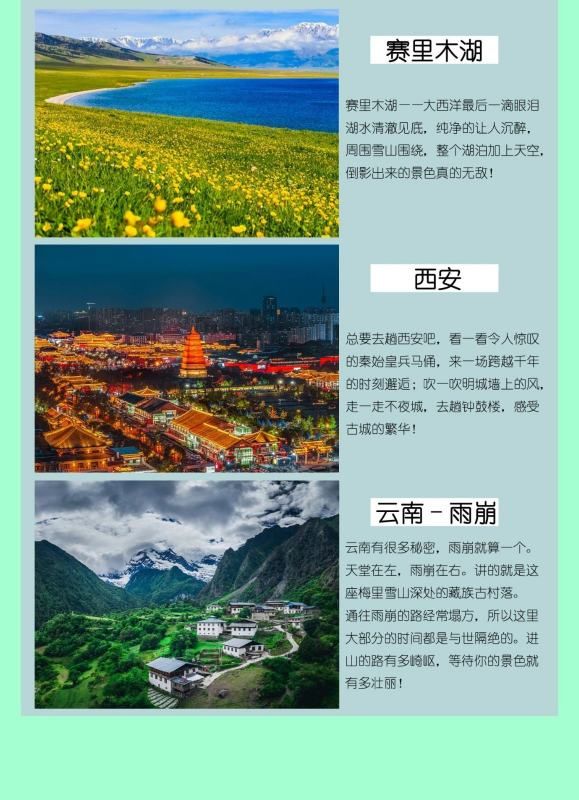 2. 成都九寨沟:九寨沟以其独特的多彩湖泊和瀑布而著名。你可以在这里欣赏到令人惊叹的自然美景,并探索当地的藏族文化。