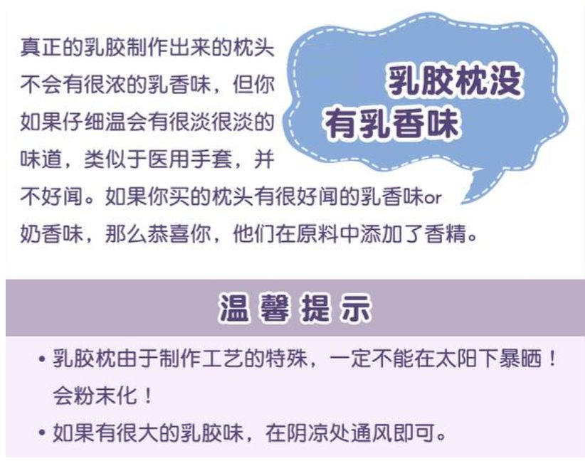 6、乳胶枕会有一定的乳胶味,如果碰到那种有乳香味的,或其他香味的,就是商家加了香精,买到有乳胶味的枕头是正常的,放到阴凉处通风的就好了;千万不要在太阳下暴晒。