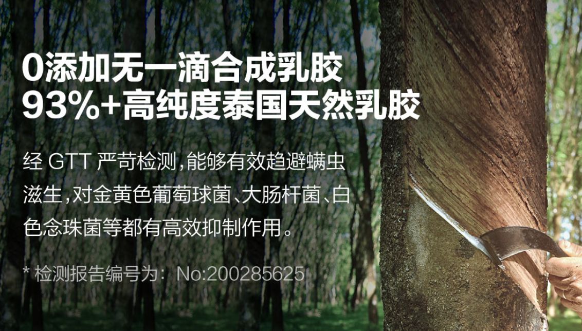 这乳胶枕橡胶含量在93%,橡胶原产地是泰国,是国内生产的,采用特雷拉工艺;而且还配上了检测报告编号。