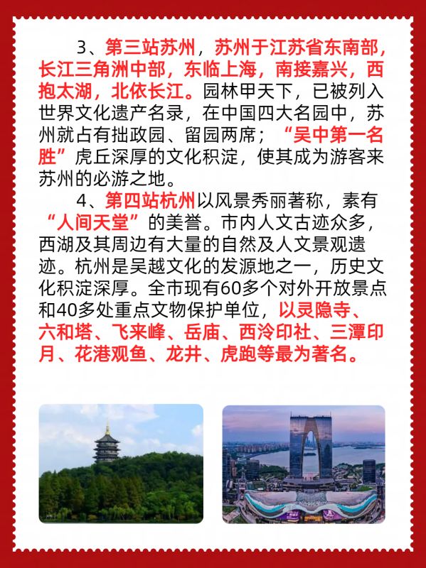 3、第三站苏州,苏州于江苏省东南部,长江三角洲中部,东临上海,南接嘉兴,西抱太湖,北依长江。园林甲天下,已被列入世界文化遗产名录,在中国四大名园中,苏州就占有拙政园、留园两席;“吴中第一名胜”虎丘深厚的文化积淀,使其成为游客来苏州的必游之地。