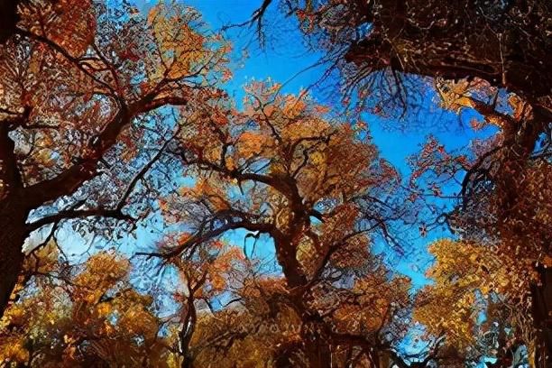 内蒙古阿拉善盟的额济纳旗,是电影《英雄》的取景地,现有天然胡杨林45万亩,是世界仅存的三大胡杨林之一,是国家自然保护区和国家森林公园。胡杨林是一个古老的树种,被誉为“植物活化石”,有“生一千年不死,死一千年不倒,倒一千年不朽”的美誉。胡杨,又名“胡桐”,为古地中海残遗物种,属落叶乔木,蒙古语称为“陶来”。胡杨木质纤细柔软,树叶阔大清香,耐旱,生命力顽强,是自然界稀有的树种之一。金秋十月,额济纳是一个童话般的世界。胡杨金叶挂满枝头,细细看来,在树枝间竟寻不到一片异色叶子,密密匝匝,金光灿烂,至纯至美;远远望去,一片片金色的胡杨把大漠装点得如诗如画,汇集成金色的海洋,吸引着大批国内外宾客到此旅游、采风、摄影。