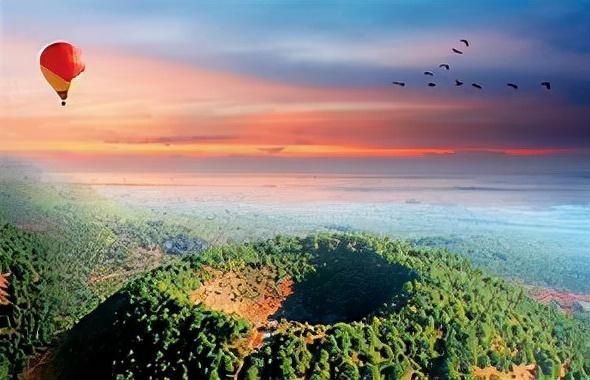 旁边的小空山不以身高取胜,“火锅口”却更大、更深。如今登上火山,不见熔岩蒸腾,烟雾弥漫,山坳里长满了树木,只能从这深深的洞口想象千万年前的烈焰。