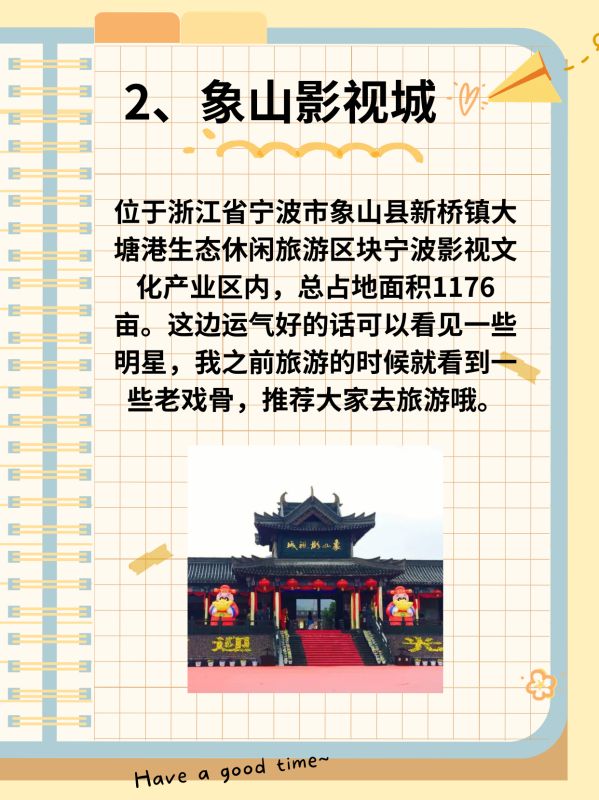 位于浙江省宁波市象山县新桥镇大塘港生态休闲旅游区块宁波影视文化产业区内,总占地面积1176亩。这边运气好的话可以看见一些明星,我之前旅游的时候就看到一些老戏骨,推荐大家去旅游哦。