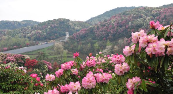 在长约50公里,宽1.2至5.3公里的狭长丘陵上,分布着马樱、鹅黄、百合、青莲、紫玉等4属,23个品种,占世界杜鹃花5个亚属中的4个亚属,最为难得的是“一树不同花”,即一棵树上开出若干不同品种的花朵,最壮观的可达7种之多。