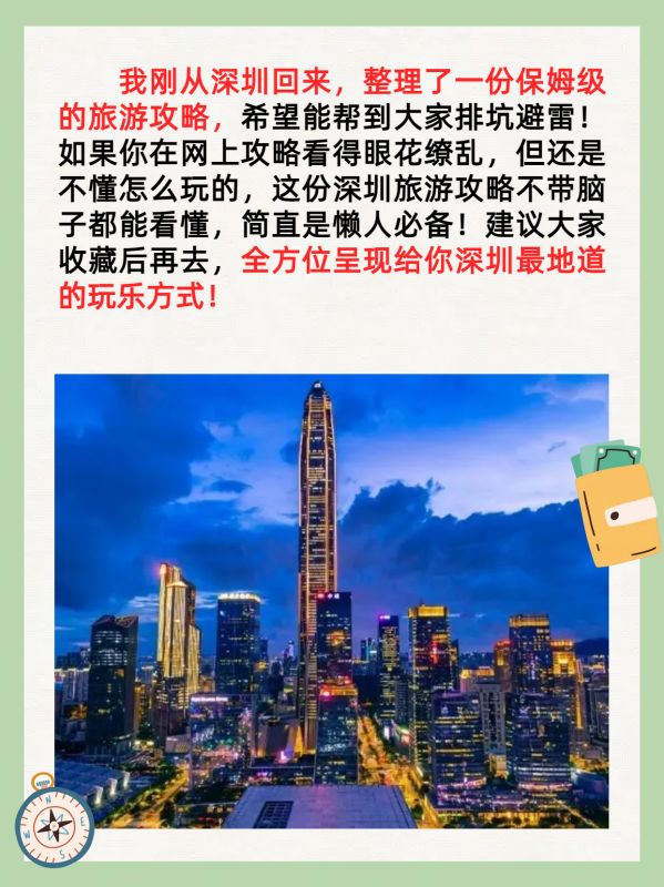 我刚从深圳回来,整理了一份保姆级的旅游攻略,希望能帮到大家排坑避雷!如果你在网上攻略看得眼花缭乱,但还是不懂怎么玩的,这份深圳旅游攻略不带脑子都能看懂,简直是懒人必备!建议大家收藏后再去,全方位呈现给你深圳最地道的玩乐方式!