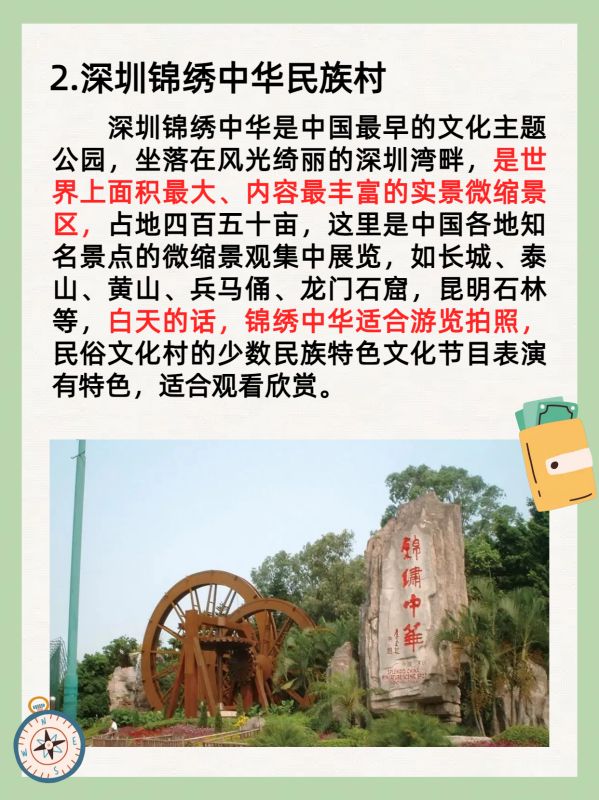 深圳锦绣中华是中国最早的文化主题公园,坐落在风光绮丽的深圳湾畔,是世界上面积最大、内容最丰富的实景微缩景区,占地四百五十亩,这里是中国各地知名景点的微缩景观集中展览,如长城、泰山、黄山、兵马俑、龙门石窟,昆明石林等,白天的话,锦绣中华适合游览拍照,民俗文化村的少数民族特色文化节目表演有特色,适合观看欣赏。