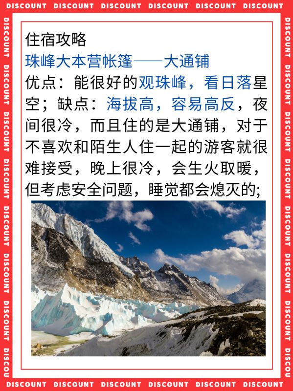 珠峰大本营游客宿营地已经下移到绒布寺,一般帐篷在3到10月会有,东游期间建议住在下面的巴松村;