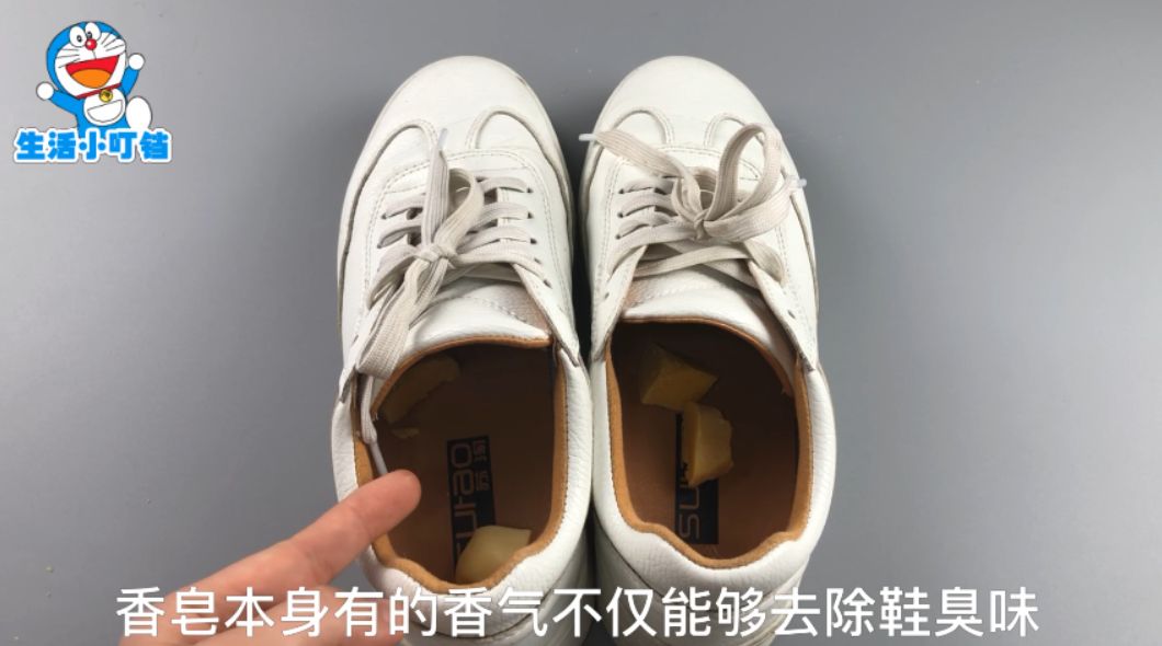 我们准备小块香皂,分别放在两只鞋子内,香皂本身的香气不仅能够去除鞋臭味,还能让鞋子变得香香的。