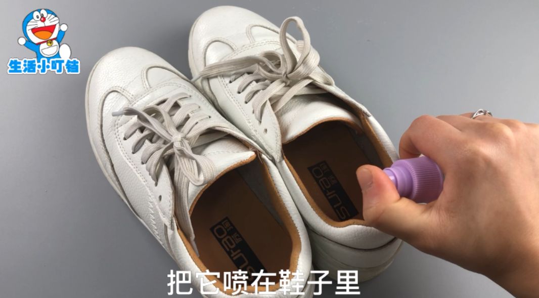 我们准备一个有水的喷壶,在喷壶里滴几滴花露水,盖上盖子,把它喷进鞋子内,不仅能够有效的去除异味,花露水含有酒精,也能起到杀菌消毒的作用。
