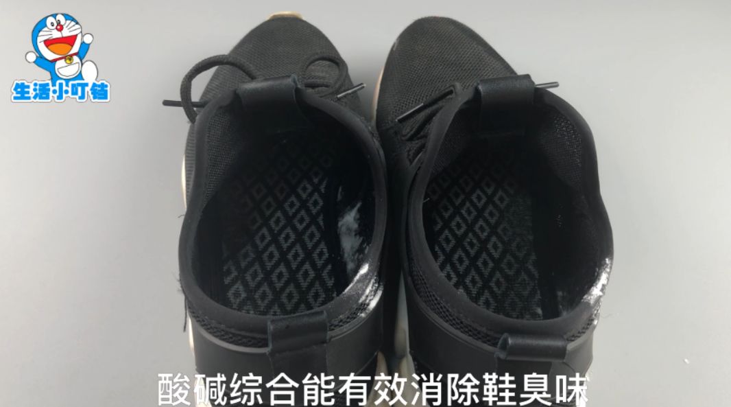 我们先把鞋垫提起来,把小苏打倒进鞋子里,把鞋垫垫回去,放一个晚上,由于小苏打的碱性,而鞋子的汗臭味是酸性,酸碱结合,能够有效地去除鞋臭味。而且小苏打能够吸收水分,能保持鞋子干燥。