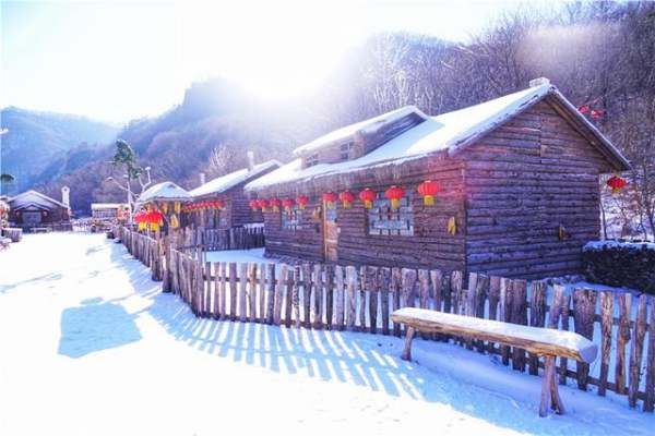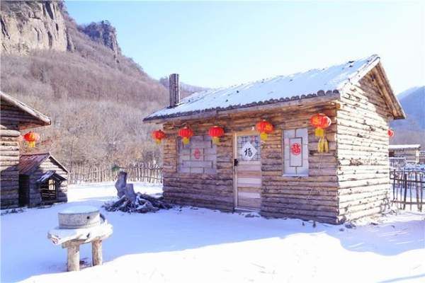 在关门山景区,还有一个雪屯,大红的灯笼点缀着梦幻的木头小屋,数座东北老式民居犹如一座座相连的梦幻雪屋,木栅栏围起来的小院子里,高悬的玉米辣椒似乎在向过往的行人暗示着,这又是一个丰收年。踩着积雪覆盖的小路一路走来,发出咯吱咯吱好听的声音,让这个寒冷的冬天充满了童趣。