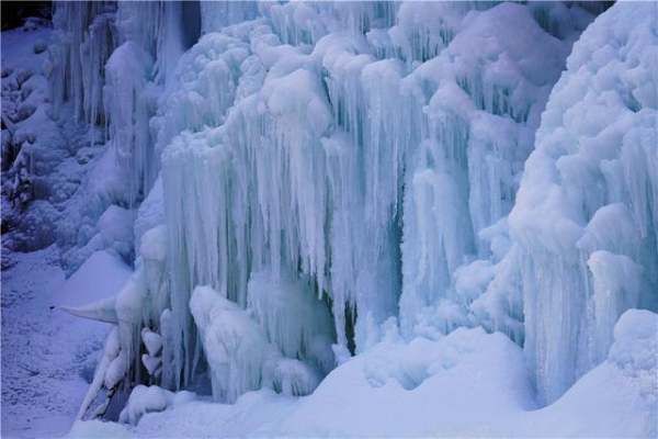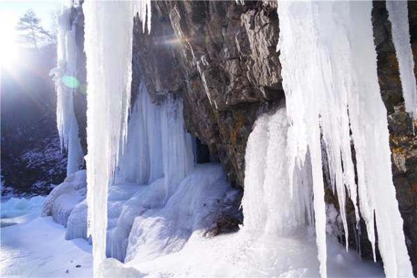 关门山的巨大冰瀑,是冬日的一大亮点,气温的骤降,让夏日里气势万钧的瀑布,瞬间定格成一条条银装素裹的冰柱,往日流水潺潺的瀑布凝结成洁白的"玉带"在山上舞动,宽阔的巨型冰瀑高悬在崖壁之上,让人感叹大自然的鬼斧神工。