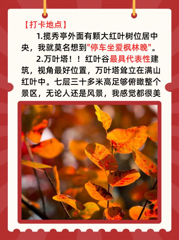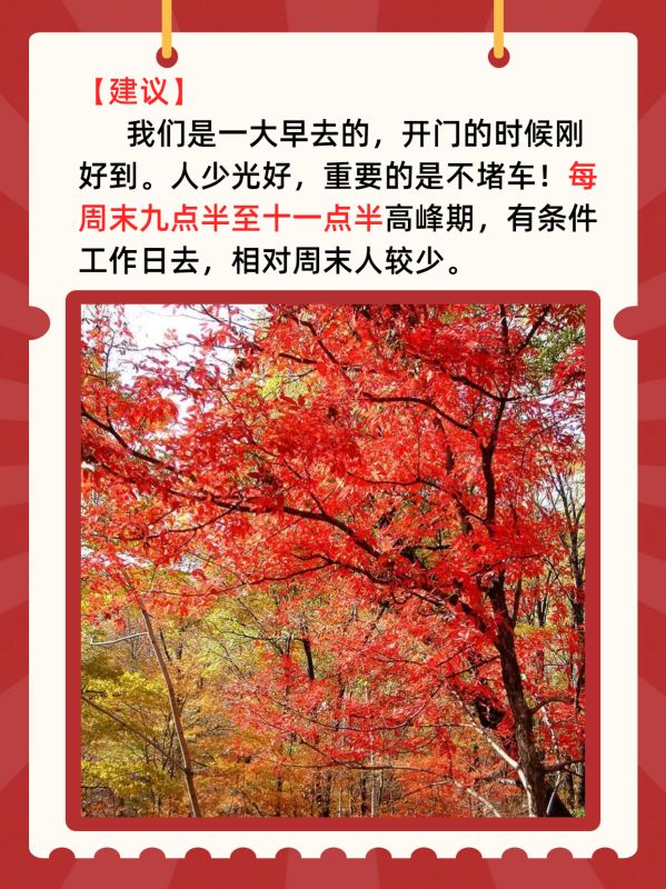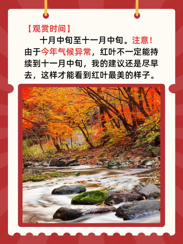 【观赏时间】 十月中旬至十一月中旬。注意!由于今年气候异常,红叶不一定能持续到十一月中旬,我的建议还是尽早去,这样才能看到枫叶最美的样子。