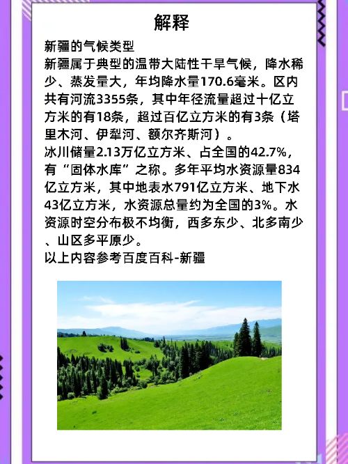新疆属于典型的温带大陆性干旱气候,降水稀少、蒸发量大,年均降水量170.6毫米。区内共有河流3355条,其中年径流量超过十亿立方米的有18条,超过百亿立方米的有3条(塔里木河、伊犁河、额尔齐斯河)。