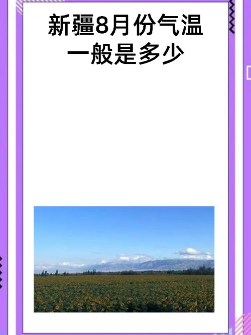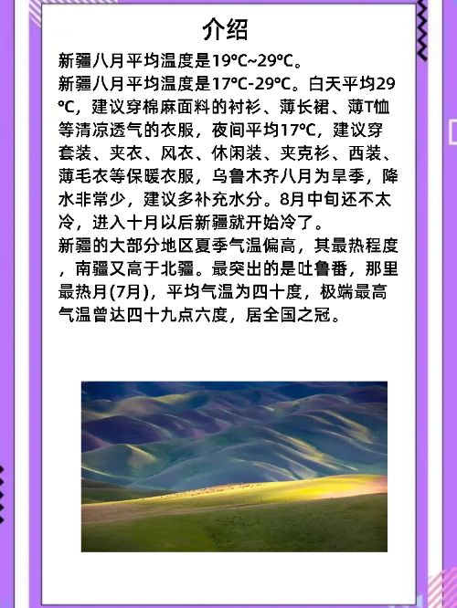 新疆八月平均温度是17℃-29℃。白天平均29℃,建议穿棉麻面料的衬衫、薄长裙、薄T恤等清凉透气的衣服,夜间平均17℃,建议穿套装、夹衣、风衣、休闲装、夹克衫、西装、薄毛衣等保暖衣服,乌鲁木齐八月为旱季,降水非常少,建议多补充水分。8月中旬还不太冷,进入十月以后新疆就开始冷了。
