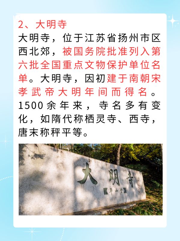 2.大明寺:位于扬州市区西北郊的大明寺,因初建于南朝宋孝武帝大明年间而得名,是国务院批准列入第六批全国重点文物保护单位的古建筑。