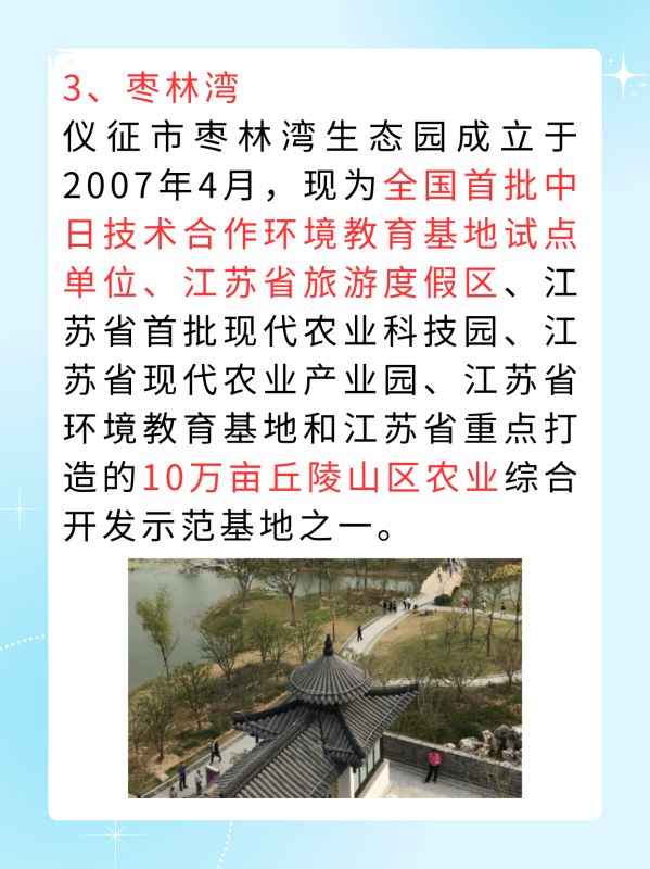 3.枣林湾:仪征市的枣林湾生态园是江苏省重点打造的10万亩丘陵山区农业综合开发示范基地之一,也是全国首批中日技术合作环境教育基地试点单位。