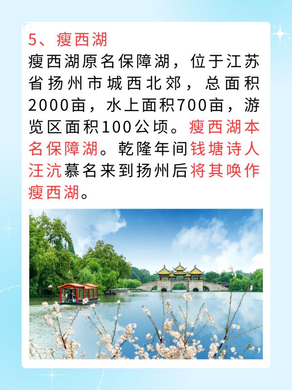 5.瘦西湖:原名保障湖的瘦西湖位于扬州市城西北郊,总面积2000亩,游览区面积100公顷,是乾隆年间钱塘诗人汪沆慕名来到扬州后将其唤作瘦西湖的地方。