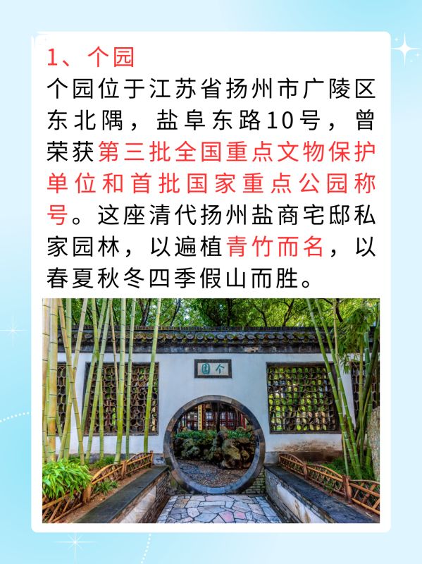 1.个园:位于扬州市广陵区的个园是扬州盐商的私家园林,以遍植青竹而名,以春夏秋冬四季假山而胜,曾荣获全国重点文物保护单位和首批国家重点公园称号。