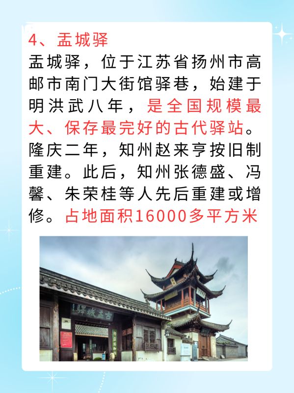 4.盂城驿:位于扬州市高邮市南门大街馆驿巷的盂城驿,是全国规模最大、保存最完好的古代驿站,始建于明洪武八年,经过多次重建和增修,占地面积16000多平方米。