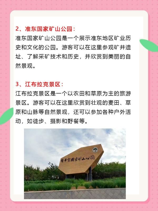 准东国家矿山公园是一个展示准东地区矿业历史和文化的公园。游客可以在这里参观矿井遗址、了解采矿技术和历史,并欣赏到美丽的自然景观。
