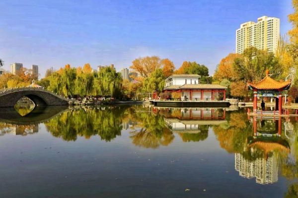 公园内景致清幽,碧树成荫,2.6公顷的人工湖清澈见底,湖边有垂柳和繁花点缀,人工堆山地形起伏,松柏覆盖;山下亭阁、长廊、小桥流水;在绿荫丛中,有民族风情的蒙古包、农家乐又一村,让人们随意野炊,享受无忧无虑的草原生活。几十个游乐设施(激流冲浪、碰碰车、赛车等)令孩子们如坠仙境,其乐无穷。